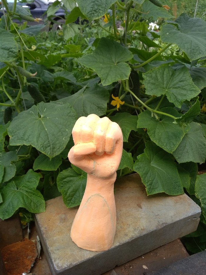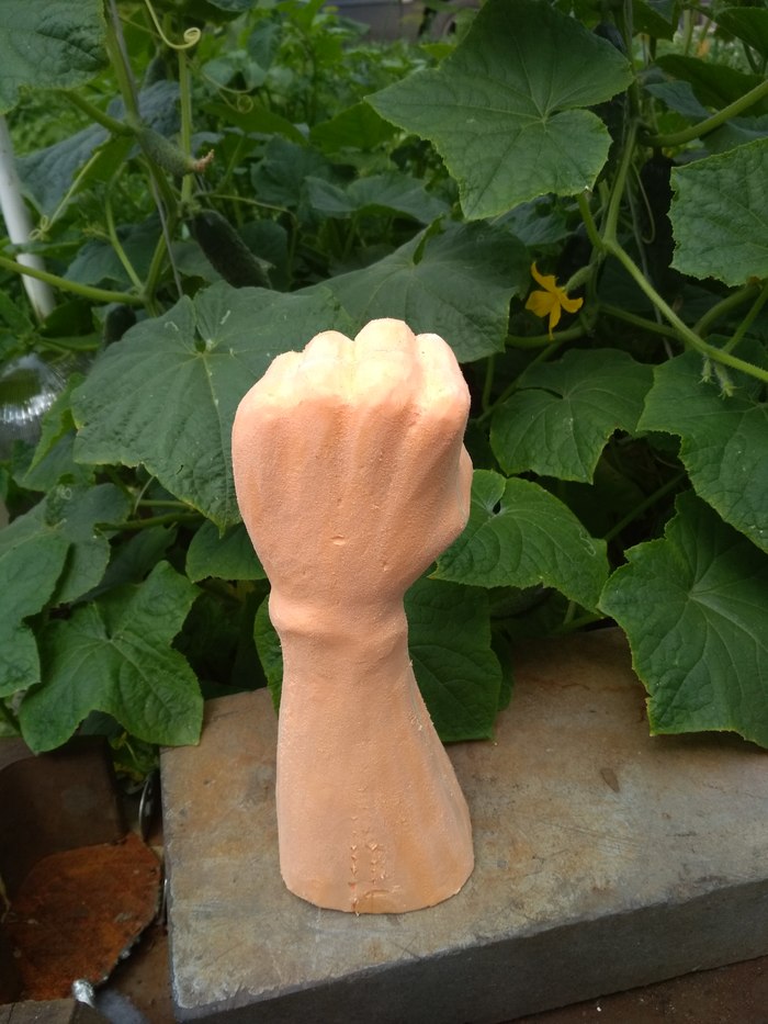 Просто так вешать лампу скучно, решил дать руке фонарь. Возникла другая проблема - пеноплекс мягковат для удержания груза, пришлось посадить руку на каркас из трубы (его фото я сделать забыл), труба под углом приварена к железному пятку, на неё насажена рука, а поперёк через трубу в кулаке проходит трубка для крепления самого фонаря.