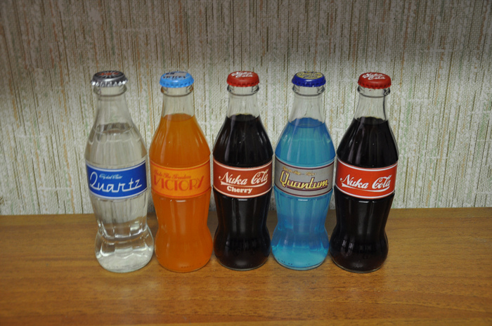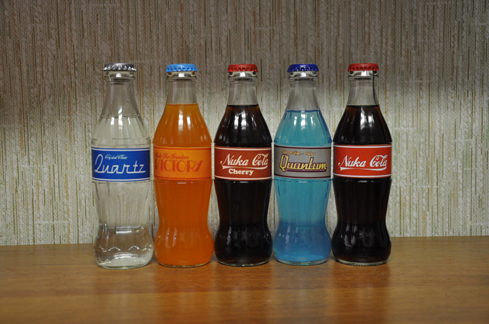 В творчестве по фаллауту отдельное место занимает ядер-кола(она же нука-кола). Обойтись без нее я никак не могла. Сделала сразу 5 видов - стандартную, вишневую, квантовую, кварцевую и викторию. К сожалению, не получилось закрыть крышки обратно достаточно плотно вручную, пришлось посадить их на клей, поэтому 3 из 5 банок слишком радиоактивны непригодны для питья. Для виктории использовала смесь фанты и гранатового сока, кварц - вода с содовой, квантум - вода с акрилом, остальные не открывала и в них обычная кола.