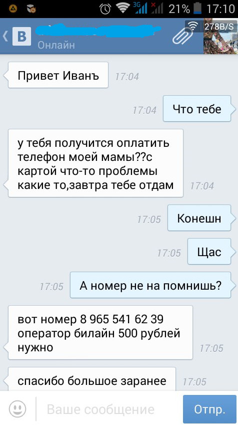 ekaekae Их ничто не останавливает... 9 лет назад или как я просила у младшего брата деньжат маме кинуть Все знают про такие разводы, но все равно находятся люди, которые любят помогать другим, не смотря даже на то, что мы уже 5 лет не общаемся. Будьте внимательнее) Показать полностью 7 Развод ВКонтакте Брат Моё Длиннопост
