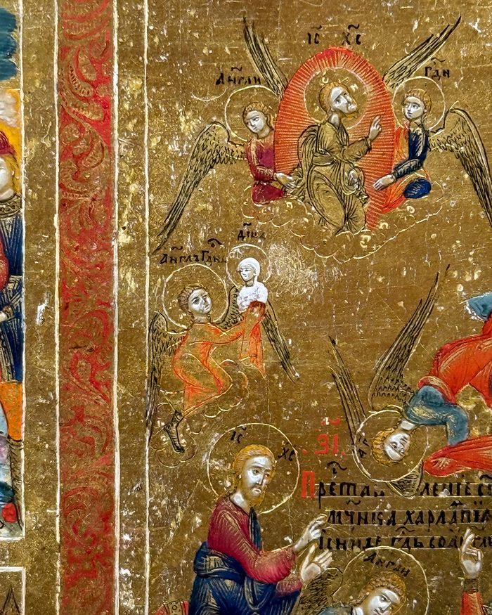 На этой иконе изображено 90 ликов. Каждый из них, кроме Харлампия в центре, меньше спичечной головки, при этом они разные, харАктерные, тщательно прописанные, а там, где ангелы уносят душу святого, и того меньше, а сам лик души - меньше спичечной головки в несколько раз!