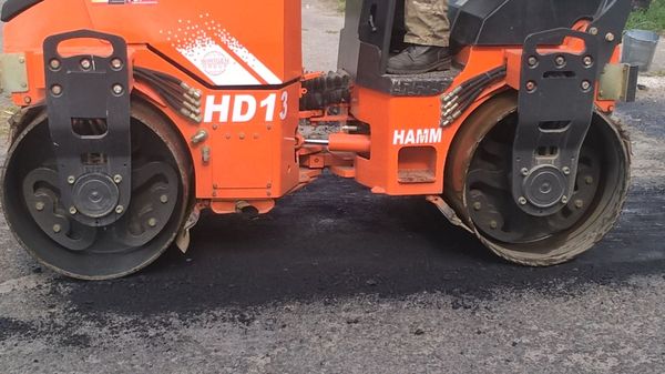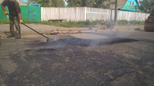 -добавляем асфальт в нагретый участок до уровня дорожного покрытия, с учетом уплотнения при укатывании,разравниваем,еще раз обогащаем эмульсией