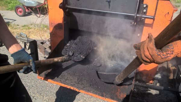 -из нижней части печки (из поддувала), достаем разогретый асфальт,пригодный для укладки