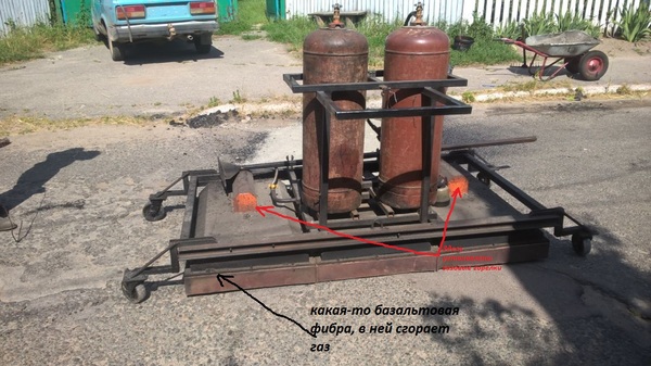 Красными стрелочками показаны кожухи горелок, горение газа происходит в слое хреновины похожей на плотную стекловату, то есть пламя огня на асфальт не лупит,но все же битум немного подгорает