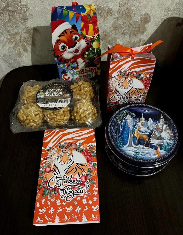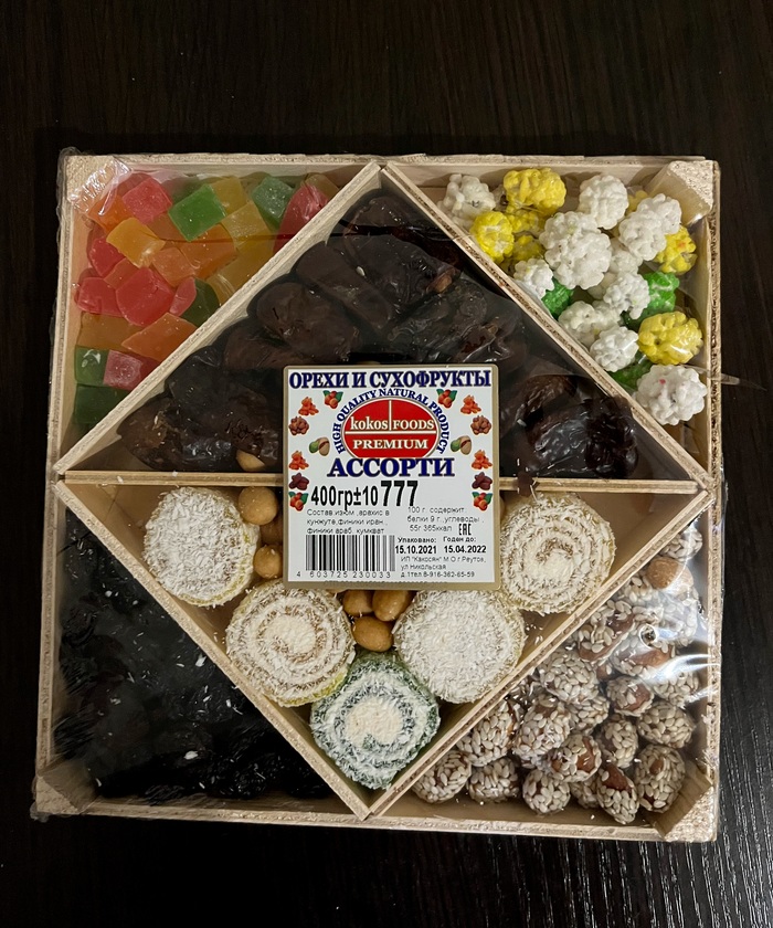 Дальше идут различные вкусности: чай, печенье, две упаковки конфет, традиционный татарский десерт - чак чак, ассорти из орехов и сухофруктов.