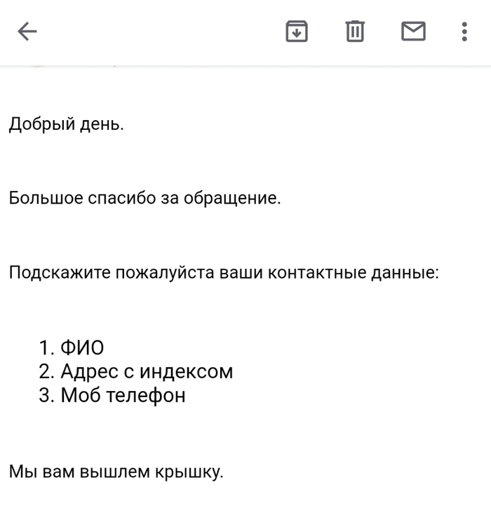 Поскольку пить из такой кружки уже невозможно всё выливается мимо рта, а выкинуть жалко, стала искать в магазах эти крышки, естественно без результатно. Читала подобные истории на Пикабу, дай думаю тоже попробую. Написала производителю на электронную почту без всякой надежды на успех. Ответили уже на следующий день.