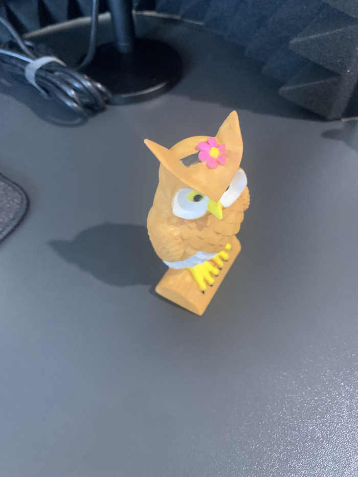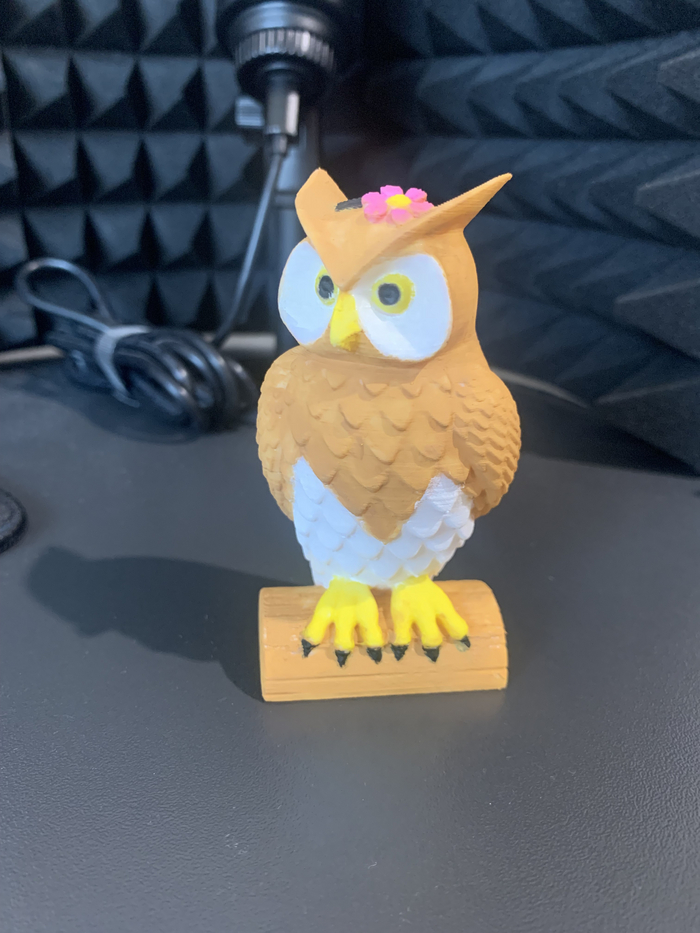 Модель совы из PLA после печати и покраски акриловыми красками кистями: