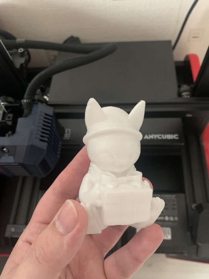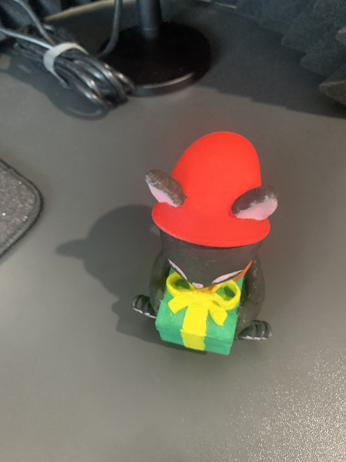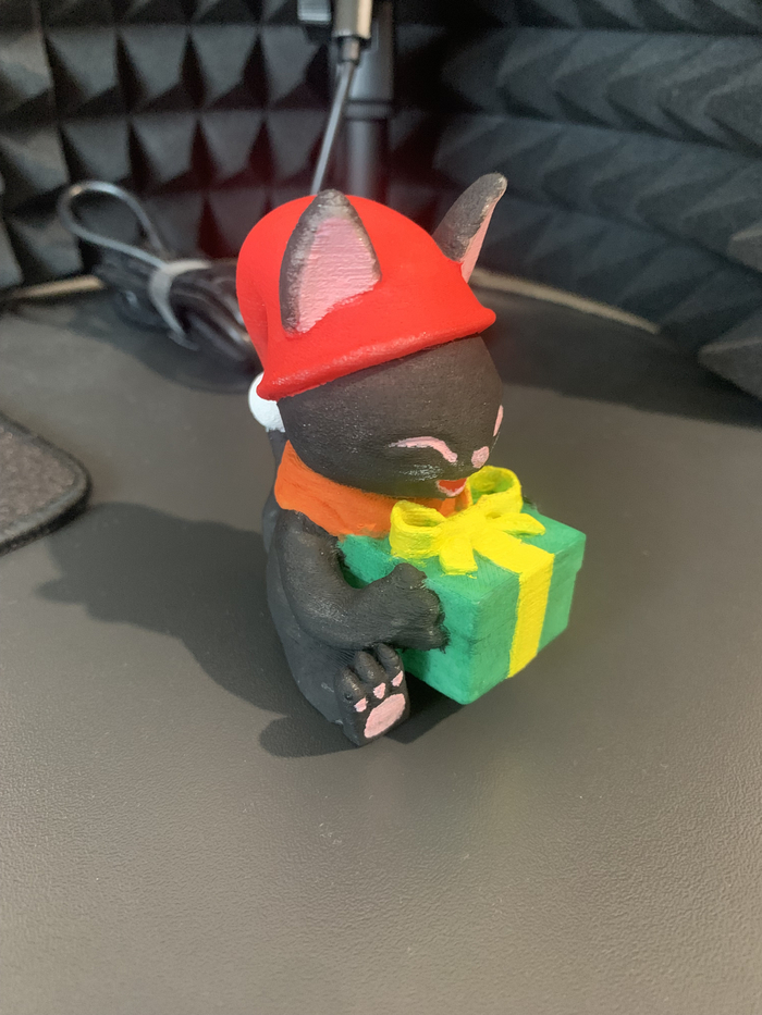 Модель котёнка с подарком из PETG после печати и покраски акриловыми красками кистями: