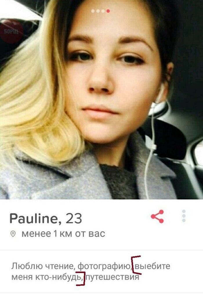 Да, заранее скажу, большую часть потенциальных партнеров, в любом приложении для знакомств, вы будете просто "скипать", т.е. пропускать, ибо когда девушка/парень пишут в 20+ лет с ошибками чуть ли не в каждом слове и игнорируют то, что телефон судорожно подчеркивает слова красным - это уже почти что диагноз. Как говорил Слава Комиссаренко: "С каждой ошибкой в тексте, желание заняться сексом с человеком уменьшается в геометрической прогрессии", что уж нам говорить о построении чего-то серьезного, с людьми, которые не умеют писать без ошибок)