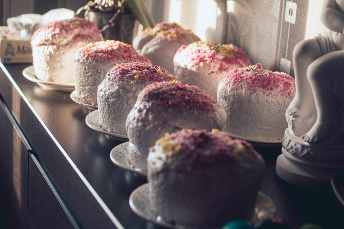 Как украшалку могу предложить покупную или самодельную глазурь (если делать самим, как я, то форму для взбивания смазать долькой лимона, 3 белка немного взбить и добавить 2 стакана сахара, после чего взбивать , взбивать,взбивать.) Куличи глазурями я обмазываю полностью кроме дна, обмазывать удобнее всего рукой, держа кулич на ладони, и пока вы мажете, запрягите мужа, жену или детей посыпать их разными посыпками и кокосовой стружкой, только быстро, а то глазурь засохнет))