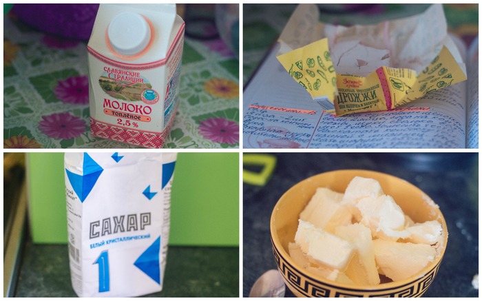 Для начала берем пластиковый или эмалированный таз литров на 10 и выливаем в него молоко комнатной температуры (можно подогреть градусов до 30), засыпаем сахар и крошим дрожжи. Накрываем наш таз большим полотенцем и ждем минут 15, после чего, если на поверхности остались комочки дрожжей стараемся руками их раздавить