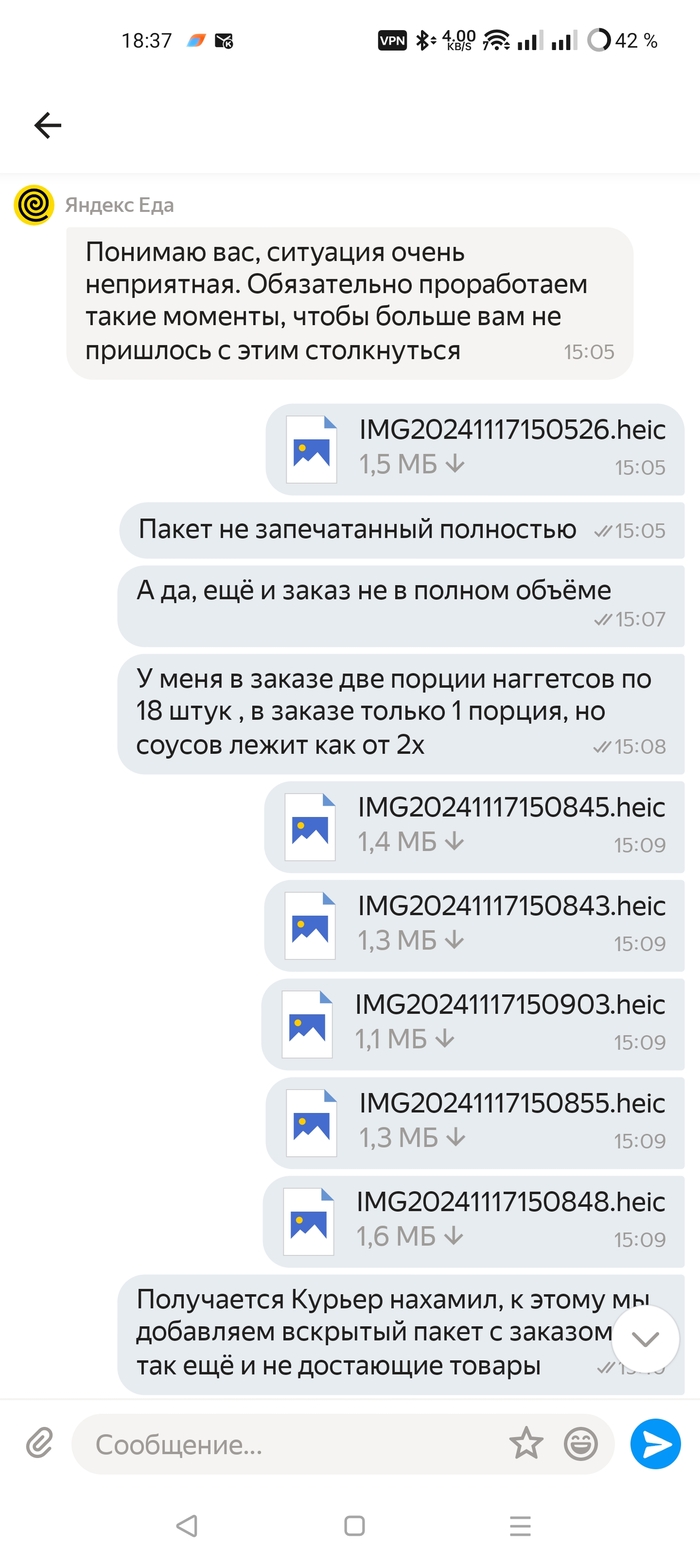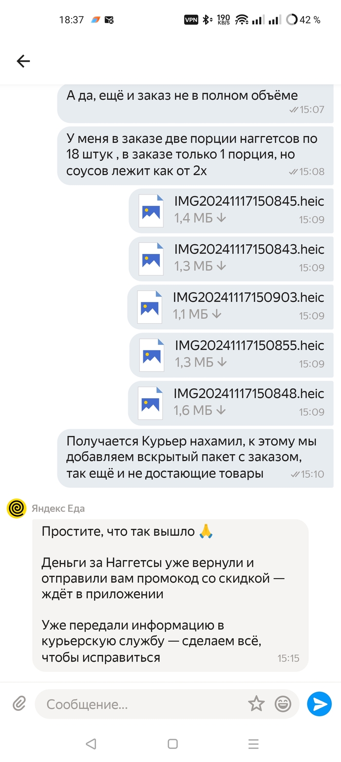 Мало того что это испортило впечатление вообще взаимодействия, так ещё сам пакет приехал не полностью запечатанным, и в нем отсутствовала часть заказа. Что этому Курьеру Аширберды, который не стесняется в трубку говорить такие вещи, стоило достать пару порций и например в них плюнуть или ещё чего похуже сделать? Выразила эти мысли службе поддержки, они принесли извинения, и вернули деньги за недостающую порцию, более в этой ситуации их ничего уже не волновало.