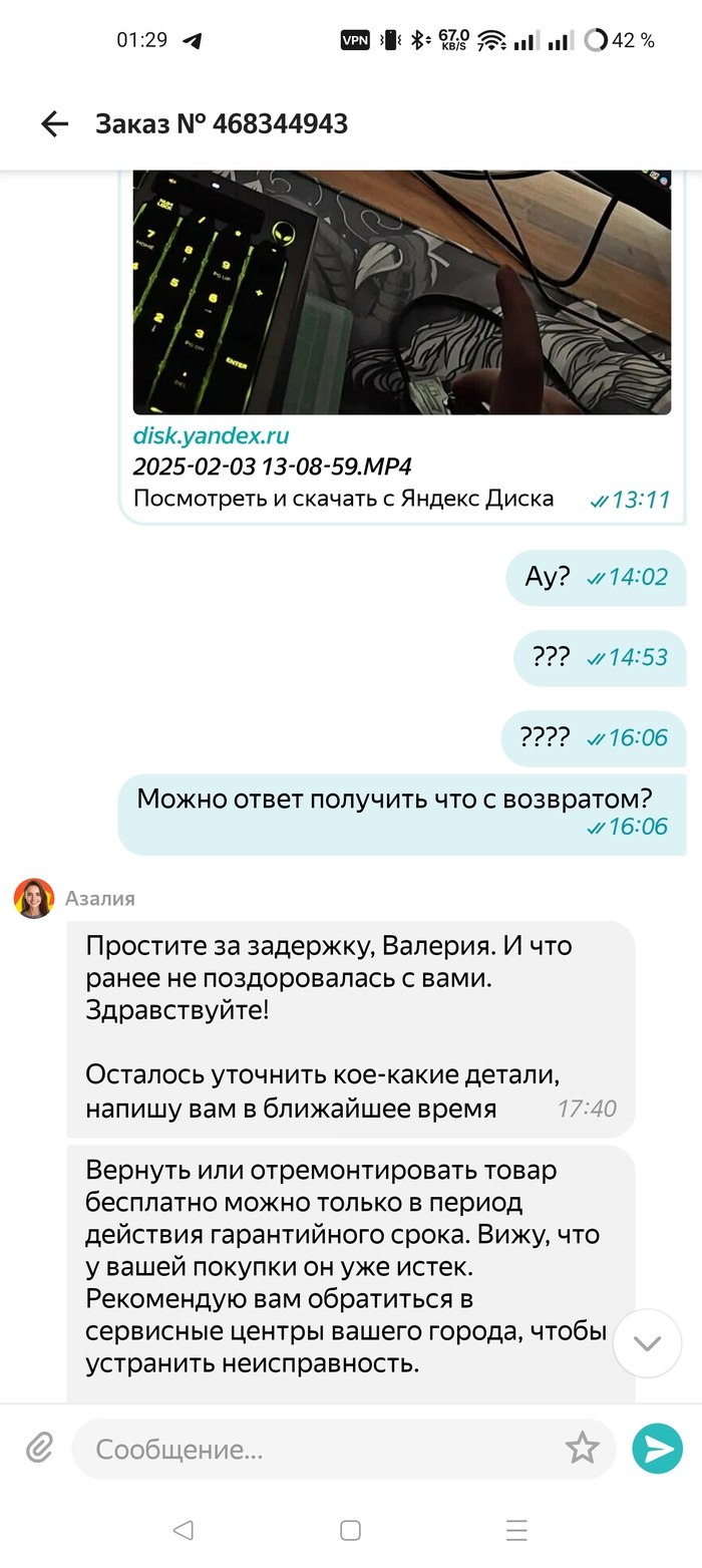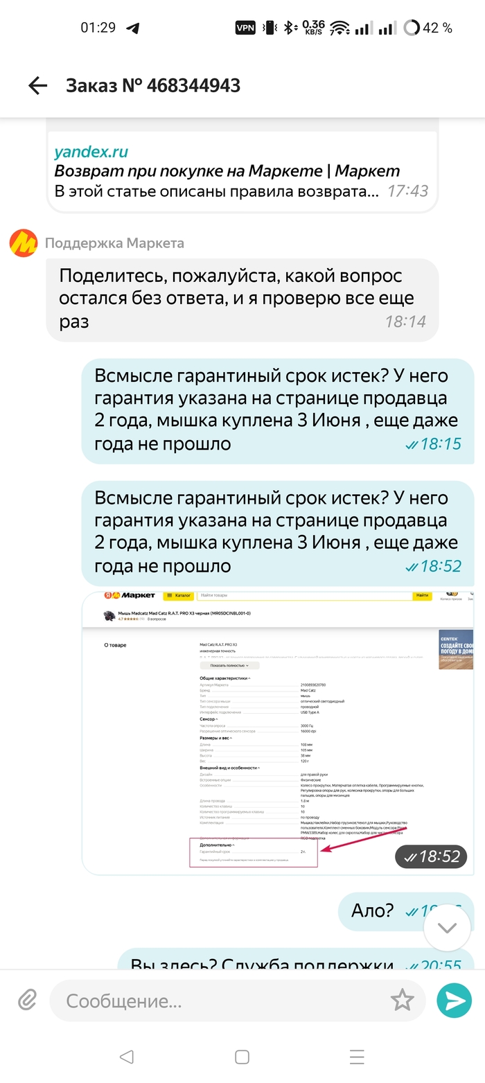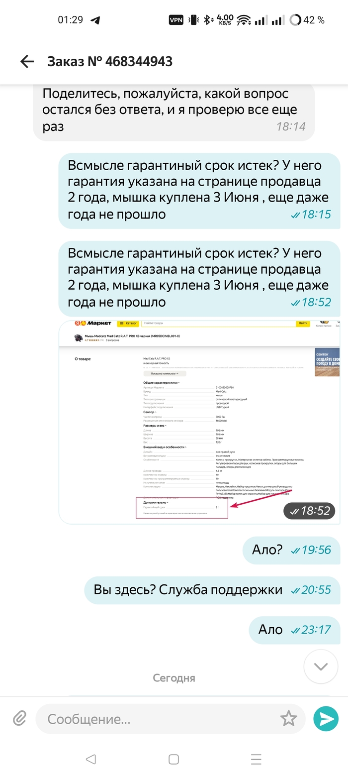 2 Июня 2024 была куплена крыса от плохих котиков на ЯМе, продавец ОНЛАЙНТРЕЙД, в карточке товара указан гарантийный срок 2 года. Путем не сложных вычислений, мы понимаем что прошло только 7 месяцев из 24. Правда, оператор Яндекс маркета так не считает, и просто закрыл мой тикет.