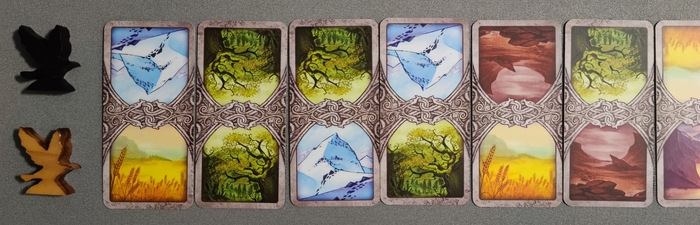 Odin's Ravens - это гонка для двоих. Игровое пространство представляет из себя последовательность из 16 карт с попарным изображением различных видов ландшафта. Каждый из воронов движется по своей половине. По достижении конца пути, ворон игрока переходит на противоположную половину, возращаясь обратно уже по стороне соперника.