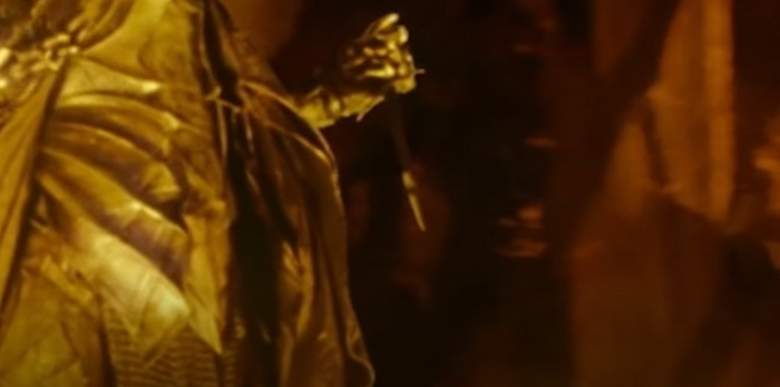 Более полное представление о создании Кольца. Саурон должен был вонзить клинок в свою ладонь через сгусток расплавленного золота, чтобы смешать свою кровь с металлом. В финальной версии можно разглядеть нож в руке Саурона.