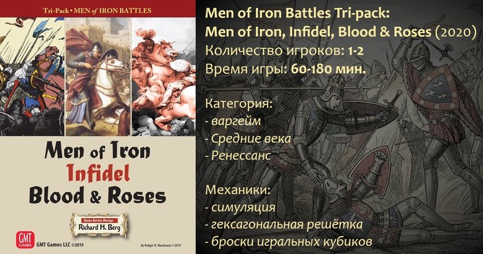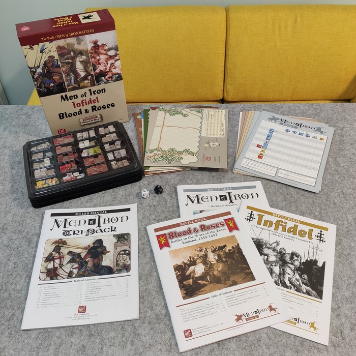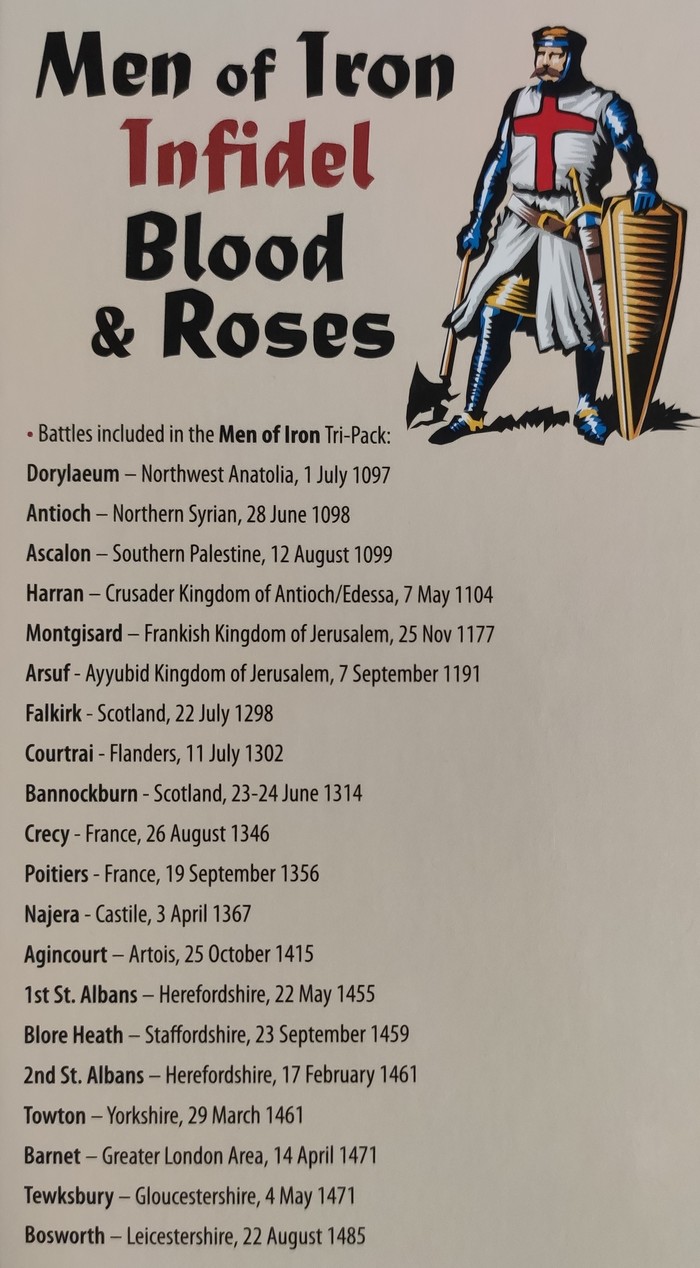 Men of Iron Battles Tri-pack будет интересен тем, кто увлекается историей и хочет попробовать себя в жанре. Традиционные варгеймы с гексами и каунтерами - это категория игр с богатым прошлым и большим количеством поклонников по сей день. Хотя игровые сессии и не выглядят чересчур захватывающе со стороны. При этом от игроков требуется усидчивость, внимание и аккуратность. (Нельзя просто так взять и повернуть кусочек картона на 60°!) И никаких тебе миниатюр с террейном. Поэтому основной компонент в игре - это фантазия. А без неё - как, например, вести в атаку своих крестоносцев с кличем Veus vult!