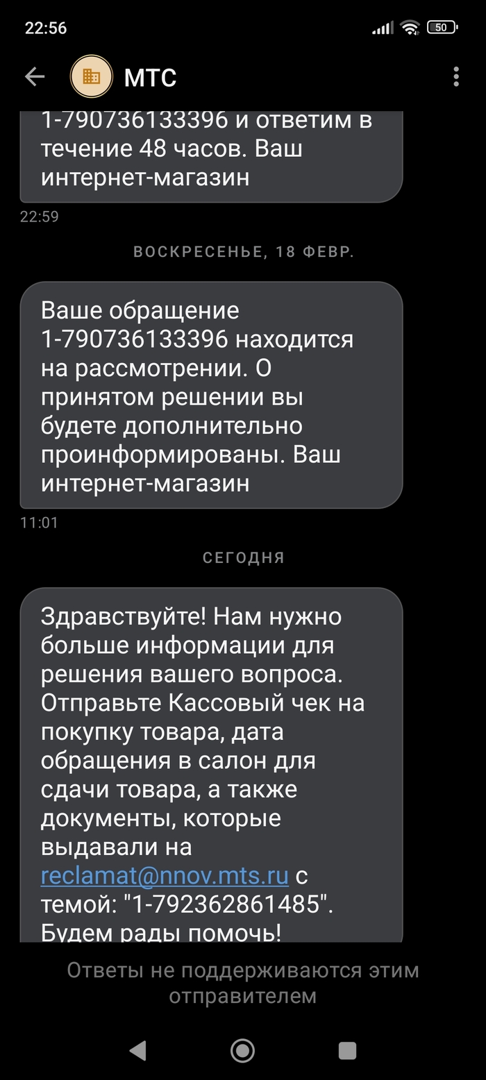 Пишите говорю что хотите, а сам в это время звоню в поддержку МТСшопа и объясняю ситуацию оператору. Там меня спрашивают адрес салона и при мне звонят менеджеру, причём я слышу как он объясняет оператору что произошло, и какие действия он выполняет. Оператор приносит свои ,,глубочайшие извинения,, за ситуацию обещает со своей стороны ускорить решение претензии и отключается. Продавец обещает что по принятию решения получив уведомление, либо он сам с рабочего телефона позвонит мне и уведомит лично