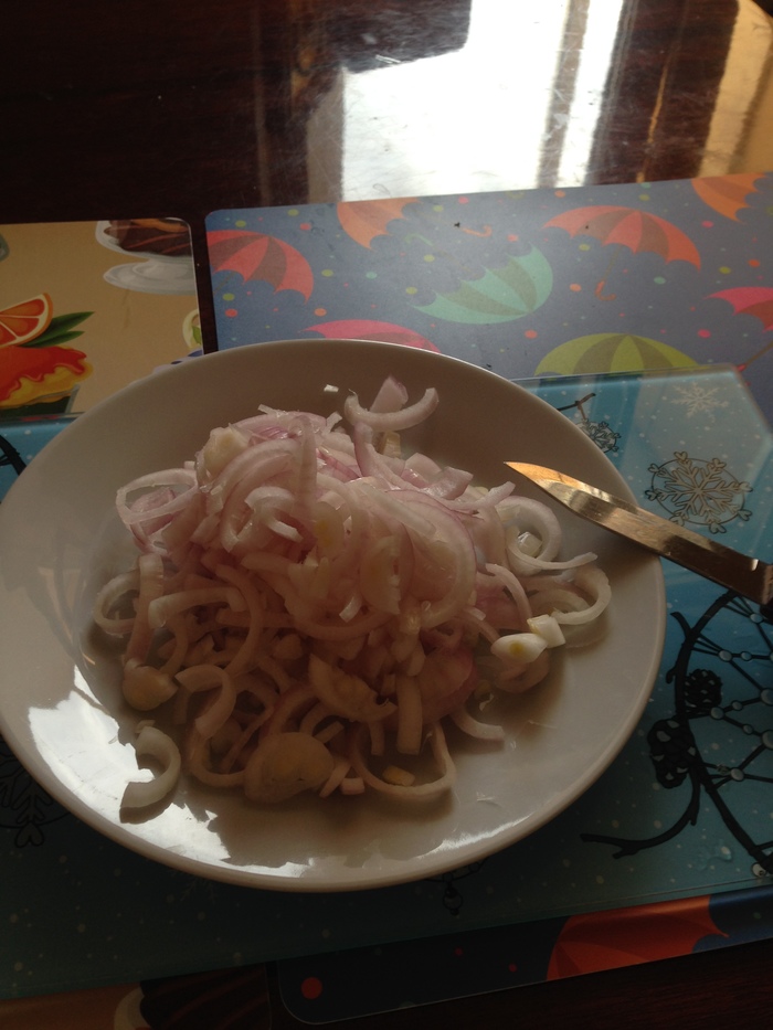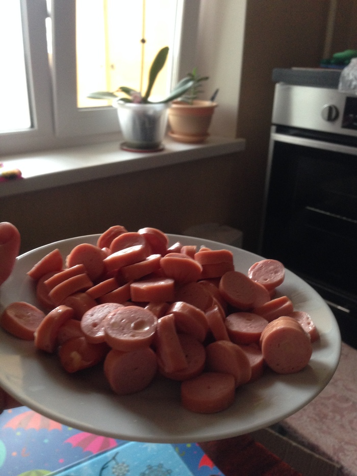 После нарезаем сосиски/колбасу/мясо у кого что...