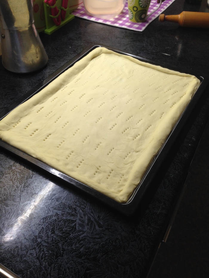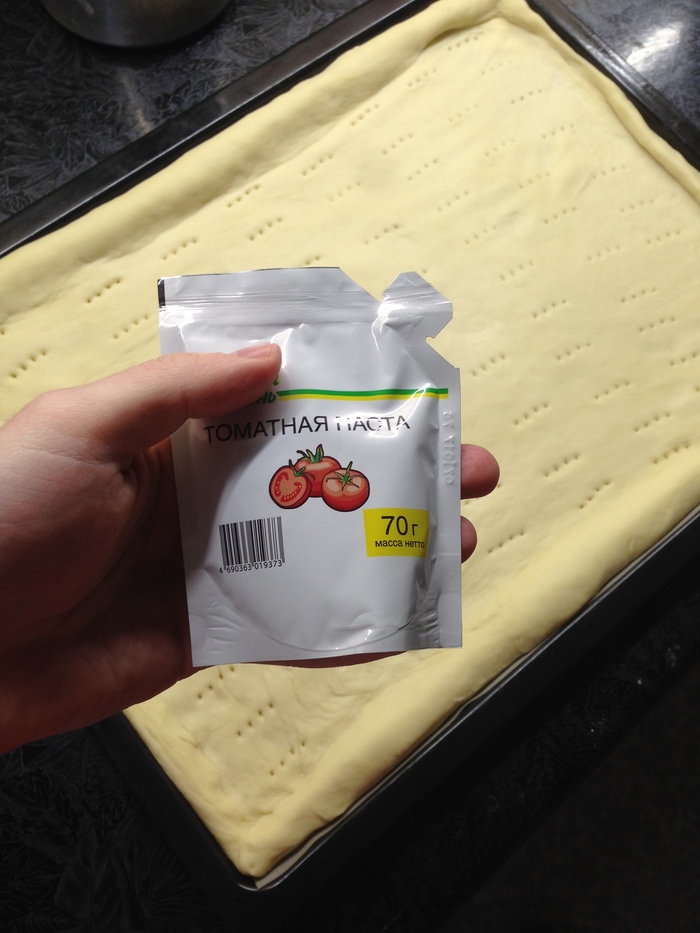Разогреваем духовку под 180, выкладываем тесто на противень, делаем небольшие отверстия по всей площади и засовываем в разогретую духовку на 10 мин.