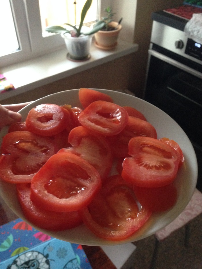 И напоследок помидор нарезаем кольцами, острый нож существенно облегчит вам эту задачу...