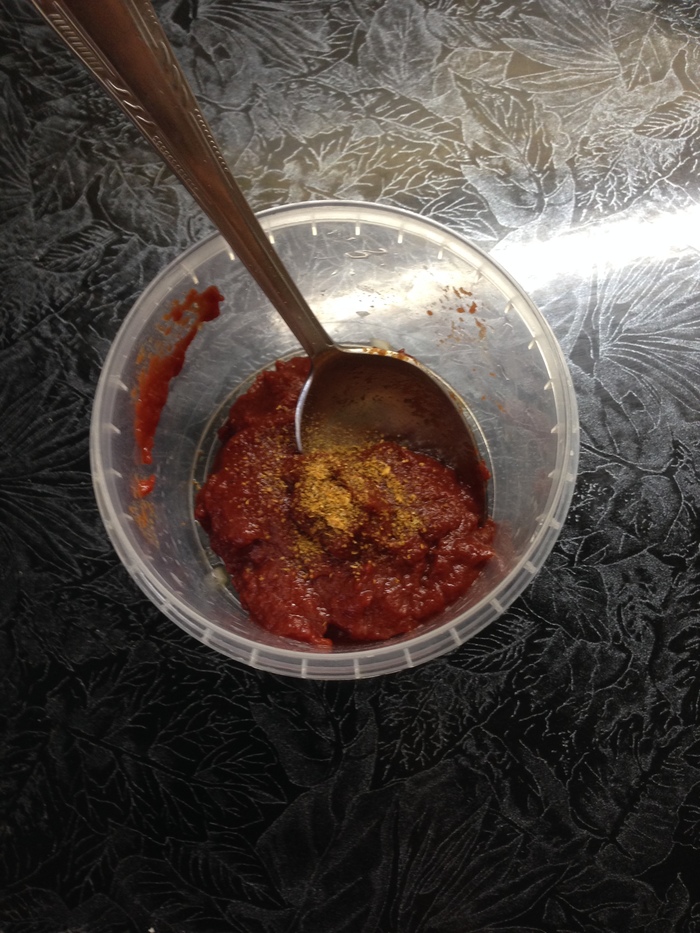Для предания остроты или пекантности можно смешать томатную пасту со специи. Я смешал с небольшим количеством аджики. Можно красный/чёрный перец, паприка, хмели-сунели и прочее, что как говориться имеете.