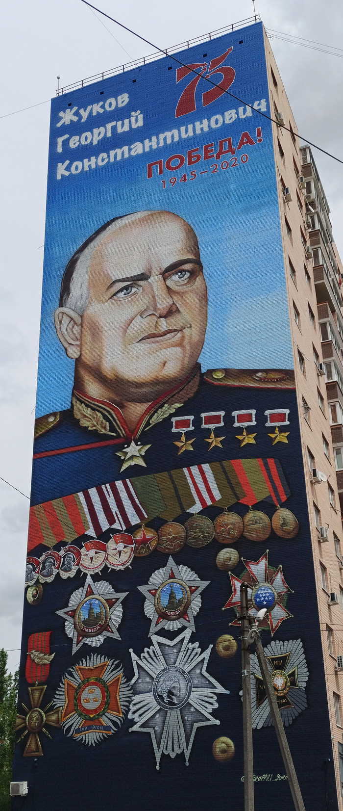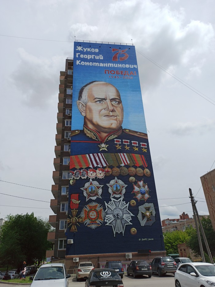Портрет маршала Победы высотой 45 метров и шириной 18 метров занял площадь в 650 кв. м. На создание изображения художникам потребовалось 15 дней, а также около 140 литров фасадной краски и 250 аэрозольных баллончиков.