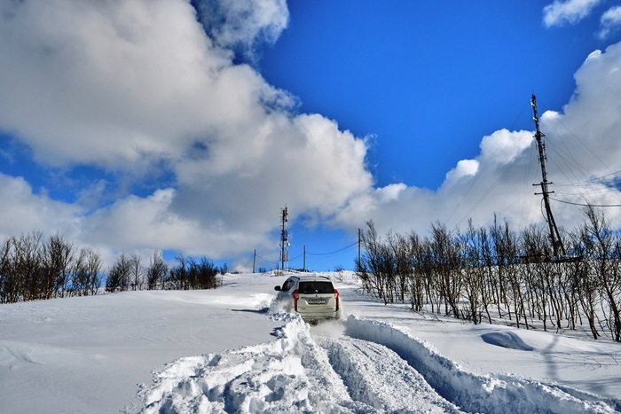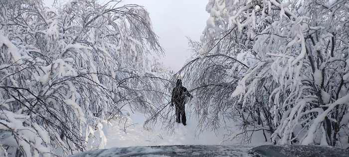 Лесную просеку проскочили за пару часов без проблем, за исключение снежных веток, прилегли плотненько на дорогу, пришлось выпускать единственного штурмана с палкой, сбивать снег, так как через метров 15-20 езды по ним дворники уже не справлялись. Остановились на выезде из леса, перекусили, так сказать пообедали, сверились с картой, наметили предполагаемую точку для ночевки. Ну и начали понемногу забираться на перевал. Перепады высот у нас начались практически со старта, от 120 до 240 метров!