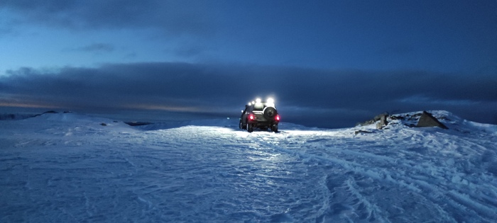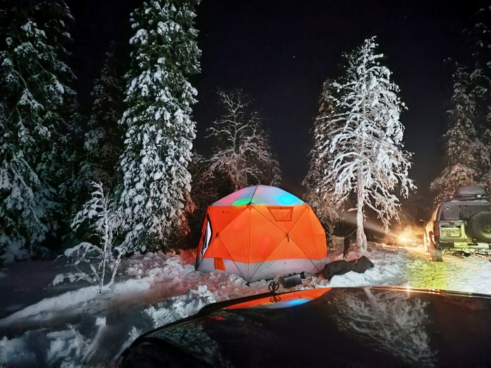 Поужинав, а по факту можно сказать, позавтракав и немного поговорив за столом, ложимся спать. Кто-то спит в палатке с печкой, но большая часть в машинах с автономными печками.