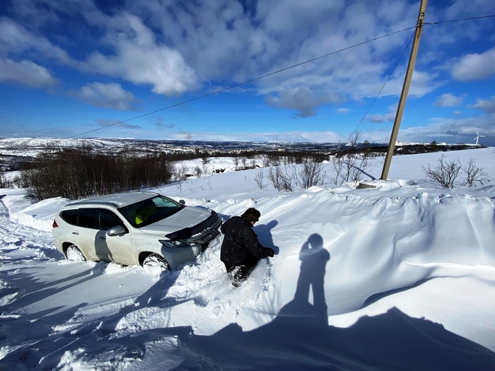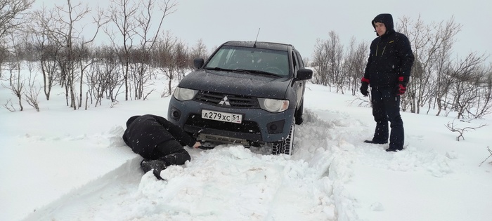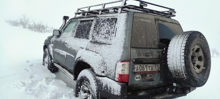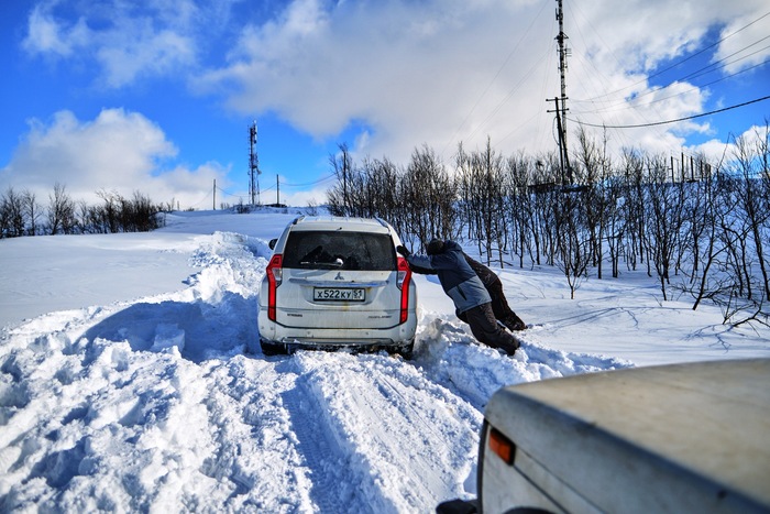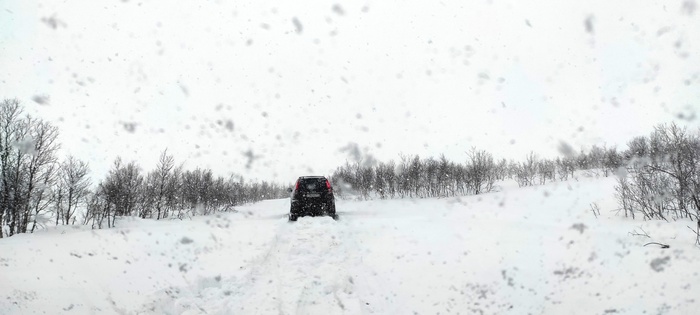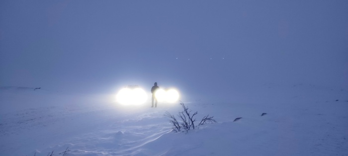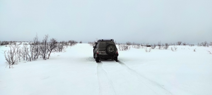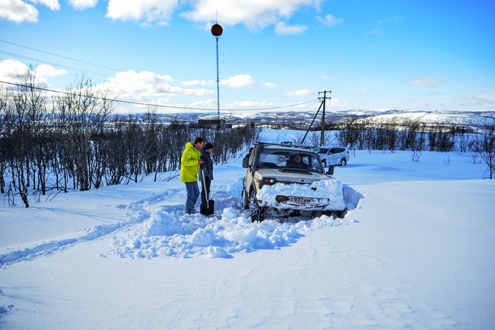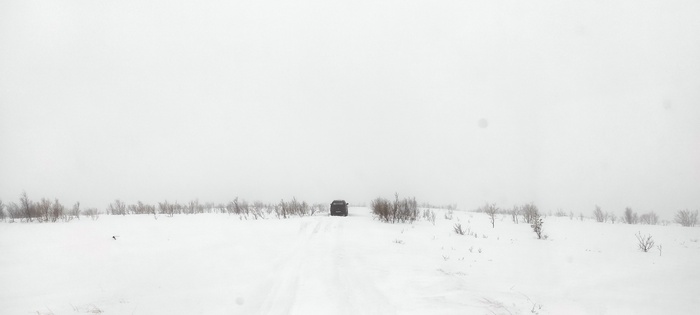 Виталик едет первый, мы убираем у него из под бампера и моста снег лопатами, и так пару сотен добрых метров. Пока трудимся не замечаем, что ветер усилился и уже наши следы сзади частично не видать!