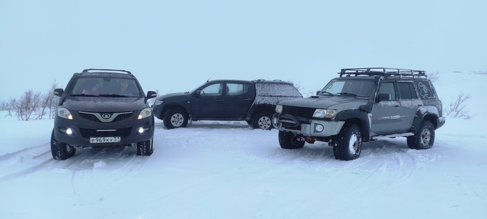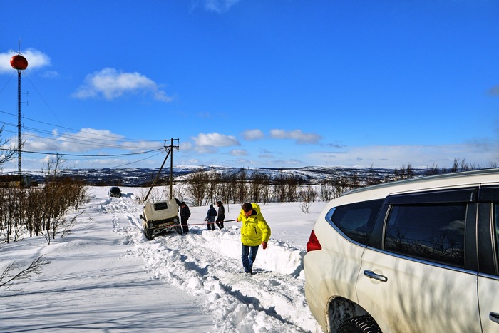 Через пару часов получилось так, что 3 машины на 35 колесах идут медленно, но идут, контролируя друг друга, иногда лебедя назад. Позади же обстановка немного труднее, проваливаются глубже, копают чаще.