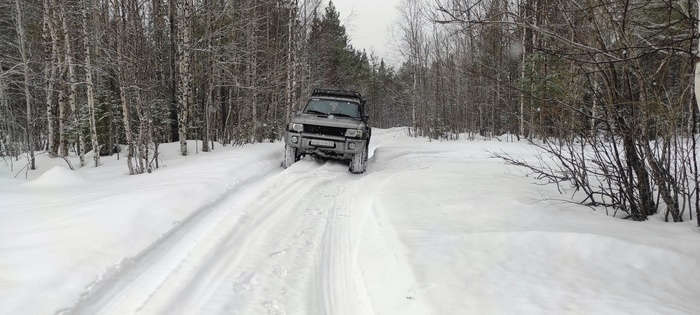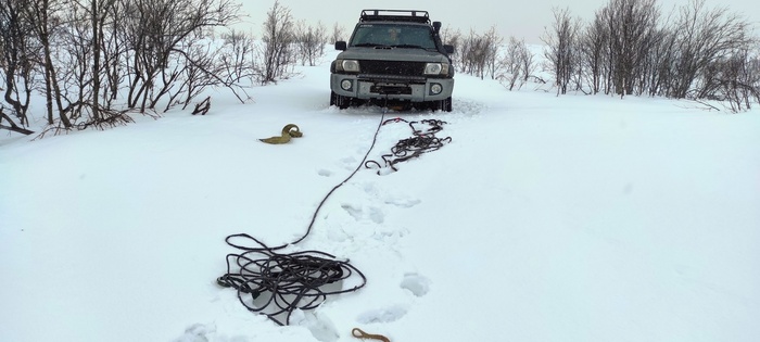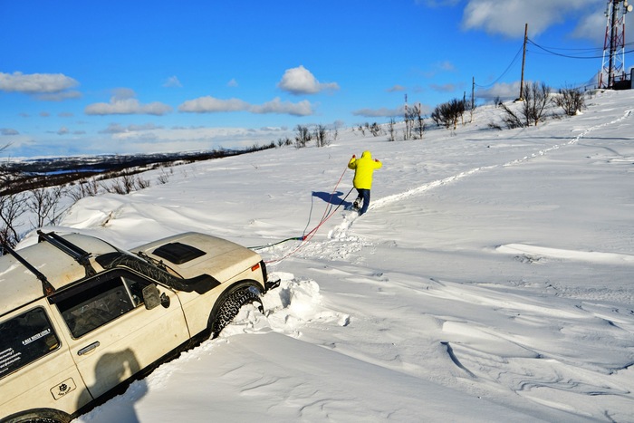 Первый затяжной подъем давался очень трудно, огромные диагонали, снега больше метра, 35 колесо прячется, страшно смотреть на эту картину. Психанул, расчехлил лебедку, пару удлинителей, корочку, откопали камень покрепче и за 40 минут забрались на подъем! Испытания новой лебедки прошли успешно, медленно, но уверенно тянет.