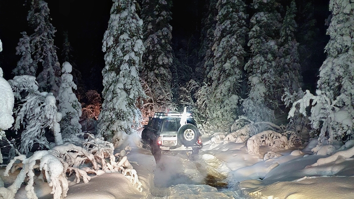На улице почти 2 ночи, ребята развернулись и выдвинулись в направлении леса. А вот мы снова начали мучиться, копать и играться лебедками. Я уже стравил колеса в 0.28атм, а машина ехать никак не хочет. Боковой уклон нашей старой колеи, и переметы частичного направления не давали машине уверенно ехать вверх. Попросту говоря, когда передние колеса упирались в новый наметенный снег, задние колеса соскакивали с колеи по уклону, и вернуться в нее ой как нелегко было. Пару раз работала практика лебежения за впереди едущего. Один проскочил, остальные лебедятся за него!