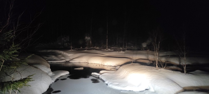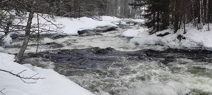 Ребята прогулялись немного по реке, лед тонкий, местами проталины, далее по течению слышны звуки воды, перекаты видимо хорошие!