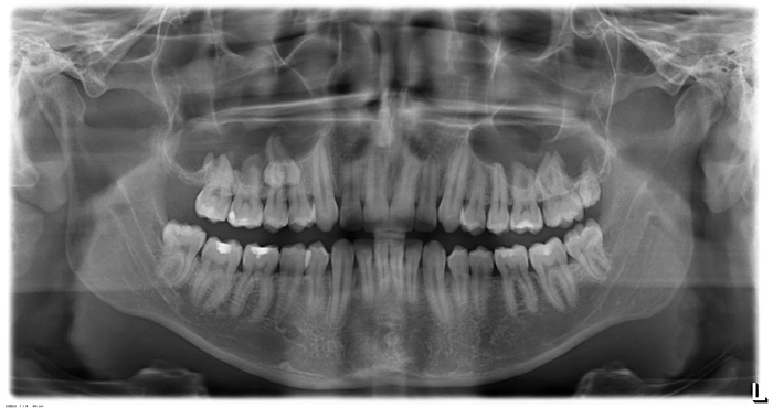 Как видно на снимке, в нижней челюсти располагается ДВА сверхкомлпектных зуба. При детальном рассмотрении снимка можно так же рассмотреть справа еще ДВА сверхкомлпектных зуба. ОДИН сверхкомплектный зуб в пазухе слева в корнях 4 и 5 зубов. А так же некоторое искажение снимка слева которое не дает 100% гарантии отсутствия там зубов сверхкомплекта.