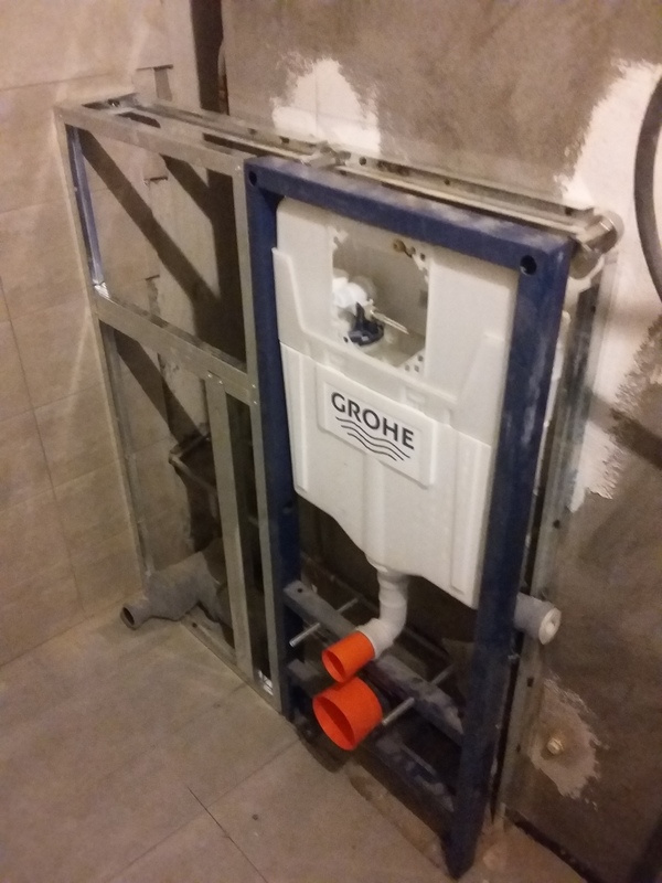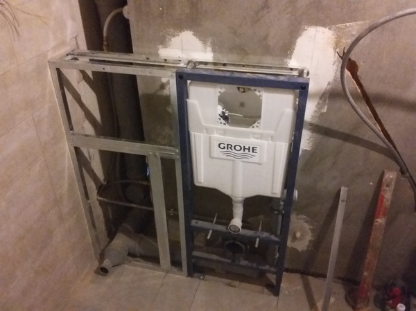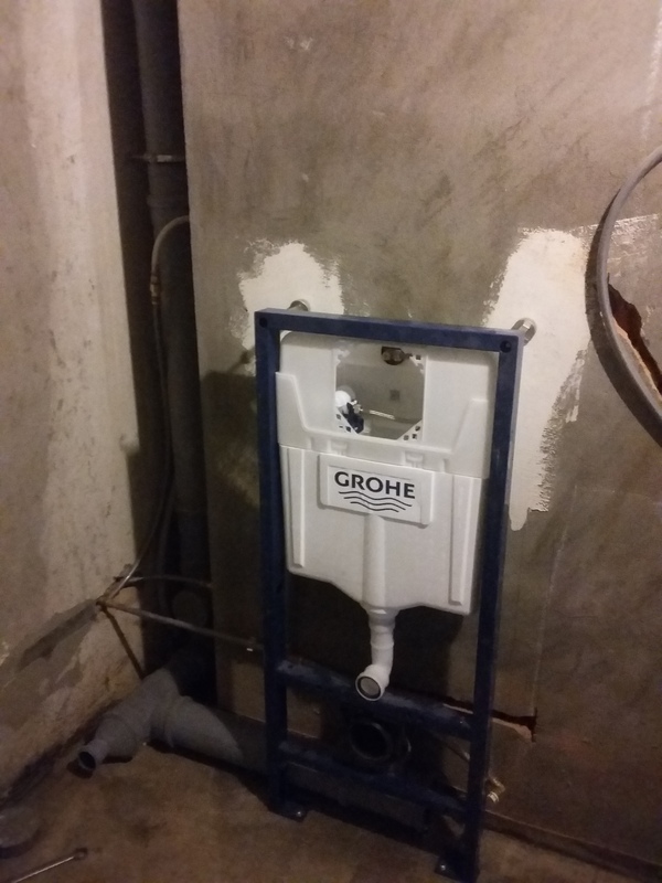 так как стена за инсталляцией оказалась из кирпичей с большими пустотами, пришлось прибегнуть к хитрости: место под будущие крепежи выдалбливается и плотно замазывается алебастером(или любой вам нравившейся смесью)