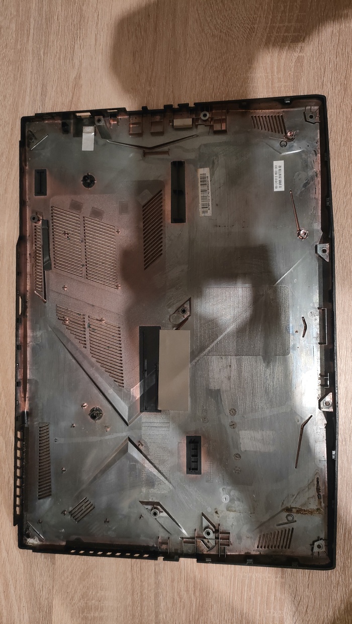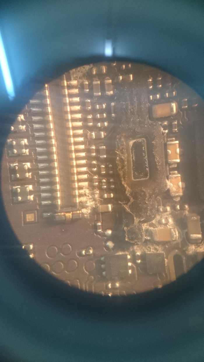 При начальном осмотре внешних следов залития не видно, но выдает себя клавиатура с залипанием клавиш и похрустованием при не большом воздействии на нее. Разбираю ноутбук и видим следы попадания жидкости, на "поддон",smd элементы и окисления, после воздействия жидкости.