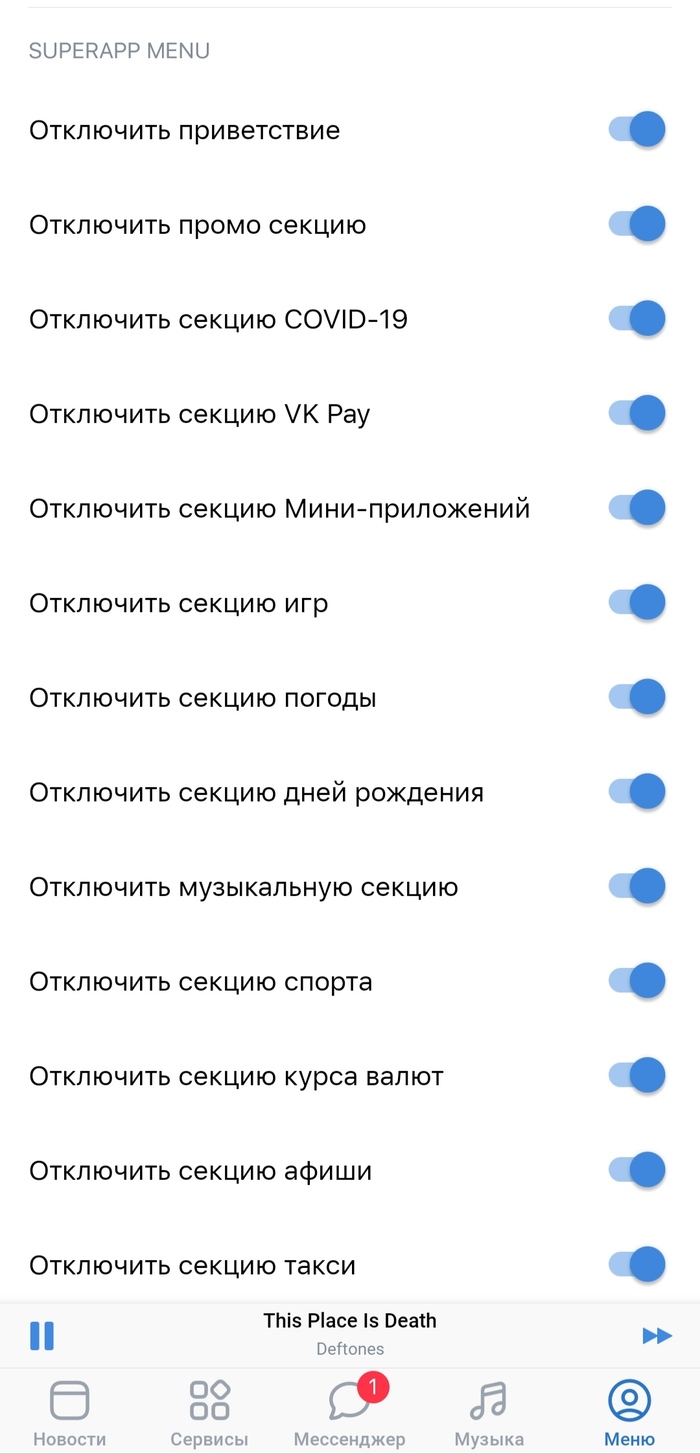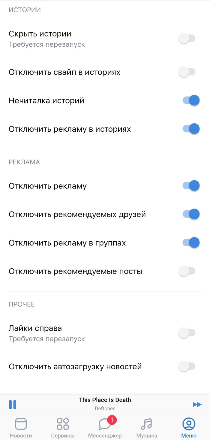 Есть два мода вк. Оба основаны на официальной версии. С расширенными настройками. В них вы можете полностью обрубить все рекламы, скрыть сторизы, скрыть всю ненужную хрень в "сервисах", убрать блядский тик-ток из док-бара (нижнего меню). Да и вообще кастомизировать эту нижнюю панель до неузнаваемости. Также там снятое ограничение с музыки и прочие плюшки, которые я вряд ли сейчас перечислю.