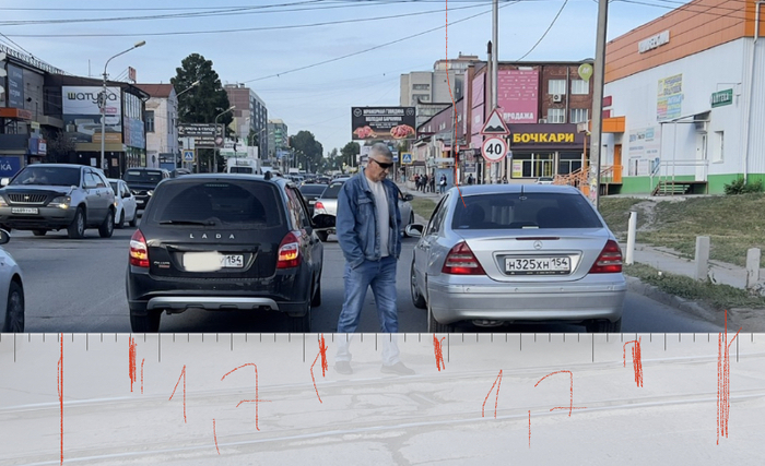 шширина каждого авто 1.7м, пропорционально делениям там получается более 5м, двойная сплошная, а значит там 2 ряда