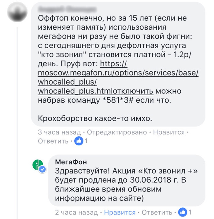 Сегодня вышел в лучшее пост, где рассказывается о том, что мегафон сделал услугу «кто звонил» платной по стоимости 1.2р/сутки. Эту знатную новость я кинул в корп. чат, а там один из наших сотрудников запилил эту инфу на фейсбук и получил от мегафона ответ.