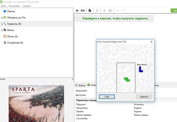 2.При нажатии клавиши T(латинской) на клавиатуре запустится игра μTris — вариант Тетриса. Её можно поставить на паузу нажатием клавиши P. Управление фигурами производится стрелками на клавиатуре