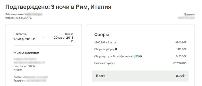 А вот с жильем в Риме все произошло гораздо интереснее) Наверное, в октябре в сети всплыл купон на 200$ на airbnb. Я церемониться не стал и сразу забронировал на денек шикарную квартиру с сауной в Хельсинки. Но, конечно же, на следующий день мою бронь отменили без всяких уведомлений. Видимо, промокод был багом. Но студенческая жизнь научила меня просто так не отпускать халяву, поэтому я зарегал аккаунт в твиттере и написал им публичное сообщение вроде: "Ну как так вы, я уже купил билеты и цветы для своей девушки, мы собирались в сауне отпраздновать золотую свадьбу, а вы так разрушили наши планы, впервые попытался воспользоваться вашим сервисом и такой кидок....". В общем, купон на удивление вернули, видимо, пекутся о своей репутации. Да и компания не российская)