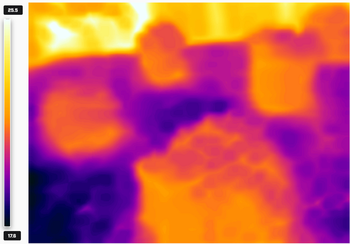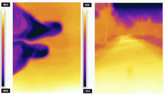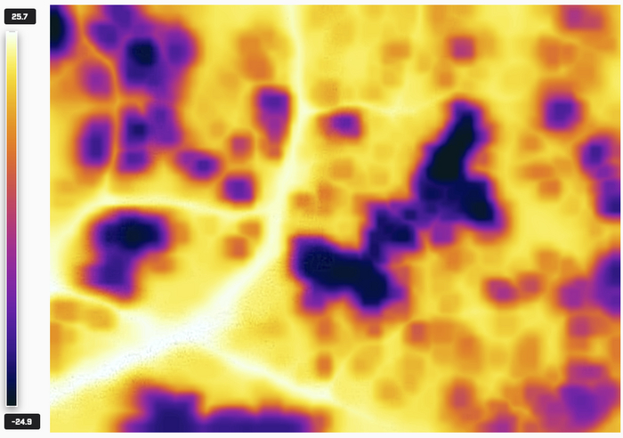 Кроны деревьев, сквозь которые видно небо. Интересно, что небо показывает минусовую температуру в термовизоре.