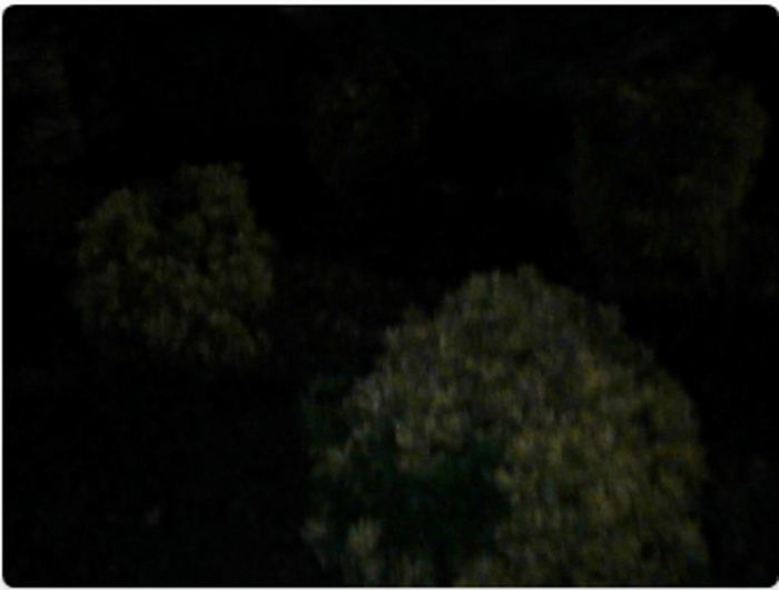 Подстриженные кусты на недавно политой земле. Освещения мало, так что обычный снимок не очень получился. Ярко светится на заднем плане тёплый бетонный забор.