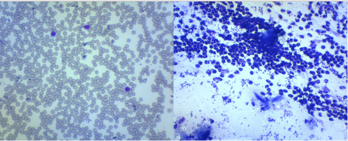Вот для сравнения в одинаковом увеличении кровь (слева) и назоцитограмма (справа). Синие точки на фото - это лейкоциты!