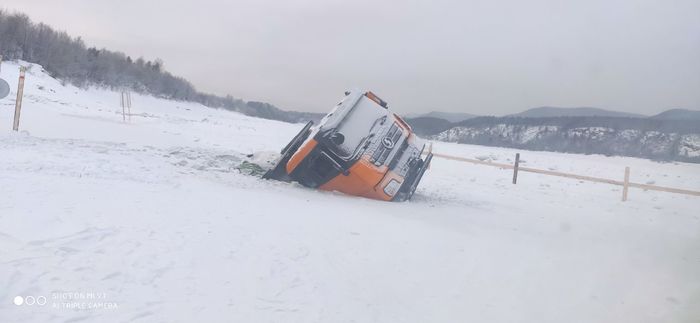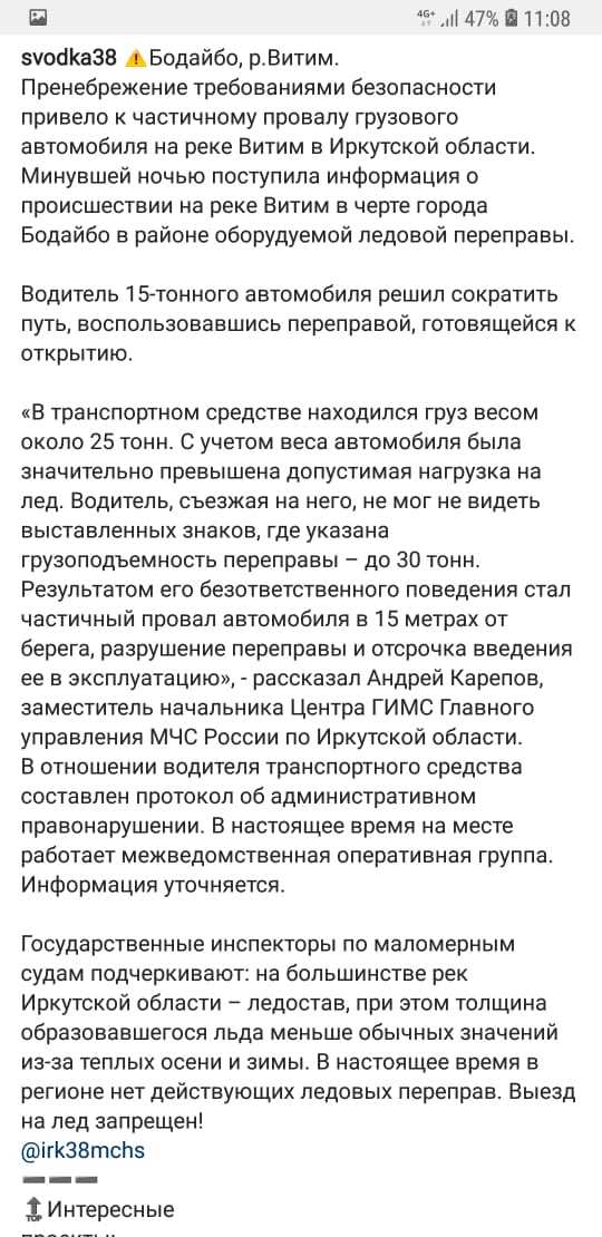 15 декабря 2020 года, Иркутская область город Бодайбо, на ледовой переправе через реку Витим произошло ЧП. Автомобиль транспортной компании ЕВА производил доставку груза, перевозка селитры. Водитель пренебрегая знаками решил проехать по переправе с ограничением в 30 тонн. Сам автомобиль весом 15 и груз в 25 тонн маленько превысило ограничения, что привело к проваллу автомобиля. Что удивляет, прошли почти уже сутки, но извлекать автомобиль или хотя бы груз никто не собирается. И проблема не в сломанной переправе, а в том что селитра отравит водоём, что приведёт к гибели рыбы, вниз по течению находятся посёлки которые используют воду из реки Витим. Бездействие местных властей и их ответ удивляет.