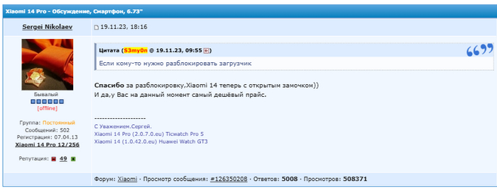 В декабре прошлого, 23ого года я начал задумываться над приобретением нового телефона. Мой выбор пал на xiaomi 14pro. Все было бы хорошо, если бы не заблоченный загрузчик в китайской версии, который не позволял полностью русифицировать телефон. Изучив тему и, в частности, 4pda я наткнулся на посты-советы обратиться к человеку, который может без труда решить проблему.