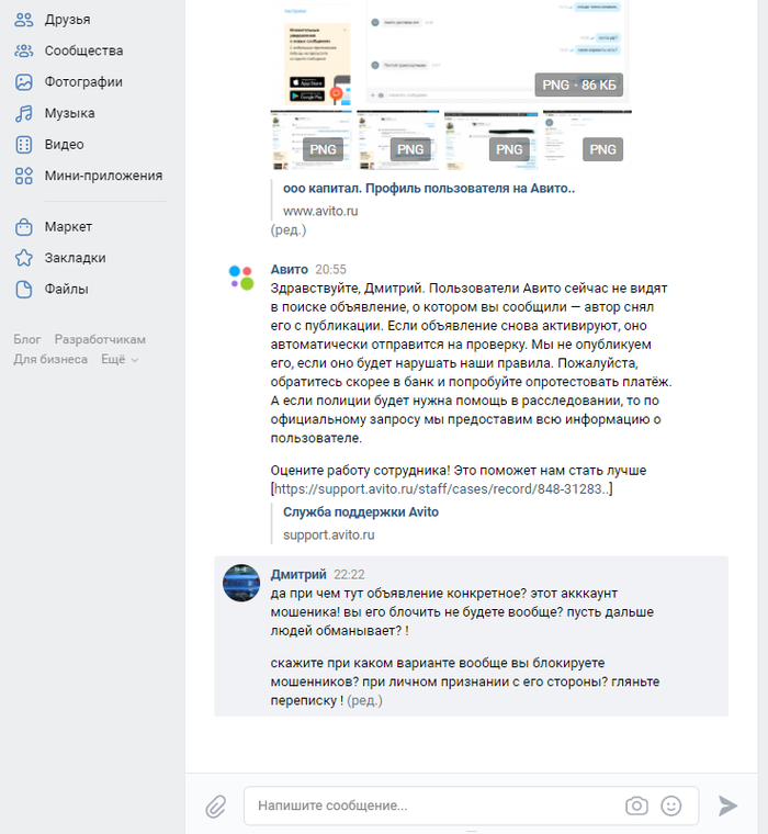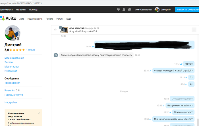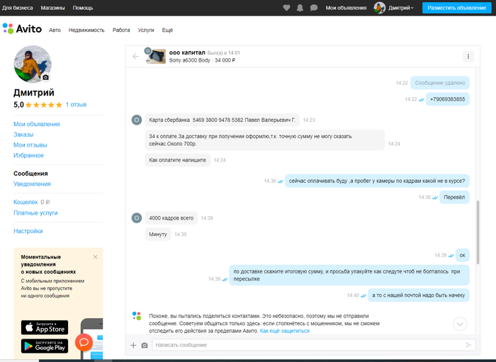 мошенник ооо капитал, продавал фотоаппарат sony a6300 после перевода денег-слился сообщения игнорит. Авито поддержка отказывается блокировать сия мошенника пишет мол нет активных обьявлений и мы не можем его забанить. Лол я вам все доки кинул, а они отказываются банить откровенного мошенника. Будте осторожны .данные мошенника(не знаю можно ли здесь полностью карту его светить ) 5469 3800 9478 53** Павел Валерьевич Г.