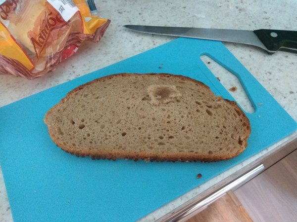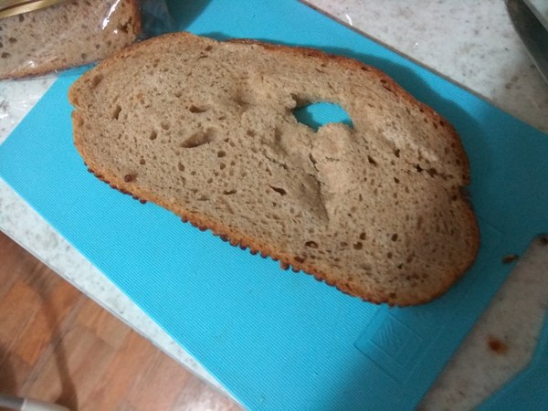 Открыл вечерком хлеб, купленный днем супругой. Первый кусок с дырой и уплотненный како-то. Причина стала понятна со вторым куском. На нем продавленный мякиш от первого куска. И вот вопрос: почему этот субъект, который так яростно прощупывал хлеб, что аж упаковку ногтем порвал, так и не взял его? Он же мягкий, свежий!
