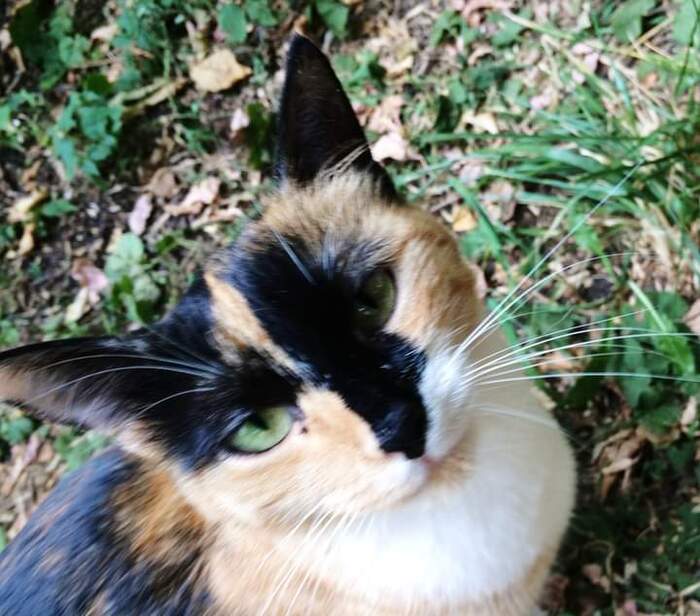 Добрая умная малышка, любит поесть влажный промкорм, охотница до птичек, ласковая и спокойная. Была отловлена со двора, куда ее выбросили котёнком. Общительная, мяукает с людьми, любит погладиться.