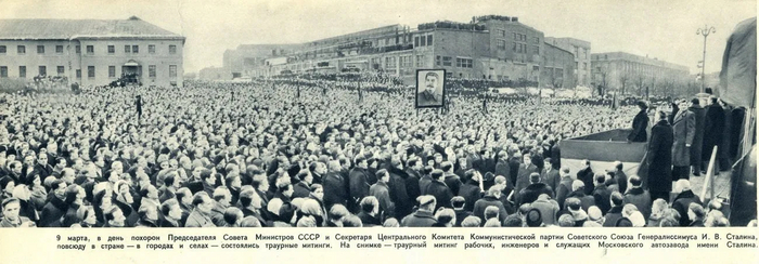 Гроб Сталина перед их теперь уже совместным с Лениным Мавзолеем. Эту фотографию журнал публиковал дважды. В первый раз — сразу после похорон. Весь номер тогда был посвящен прощанию с величайшим гением человечества. Второй раз уже в 2015 году