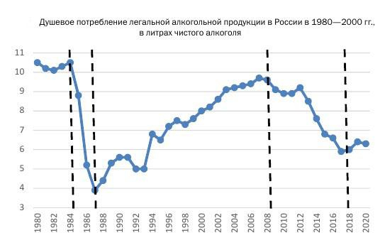 И ещё один интересный момент, если сравнить среднедушевое годовое потребление алкоголя в СССР в начале 80-х (10,6 литра), современным (11,7 литров), то станет понятно, что пить в России меньше не стали.